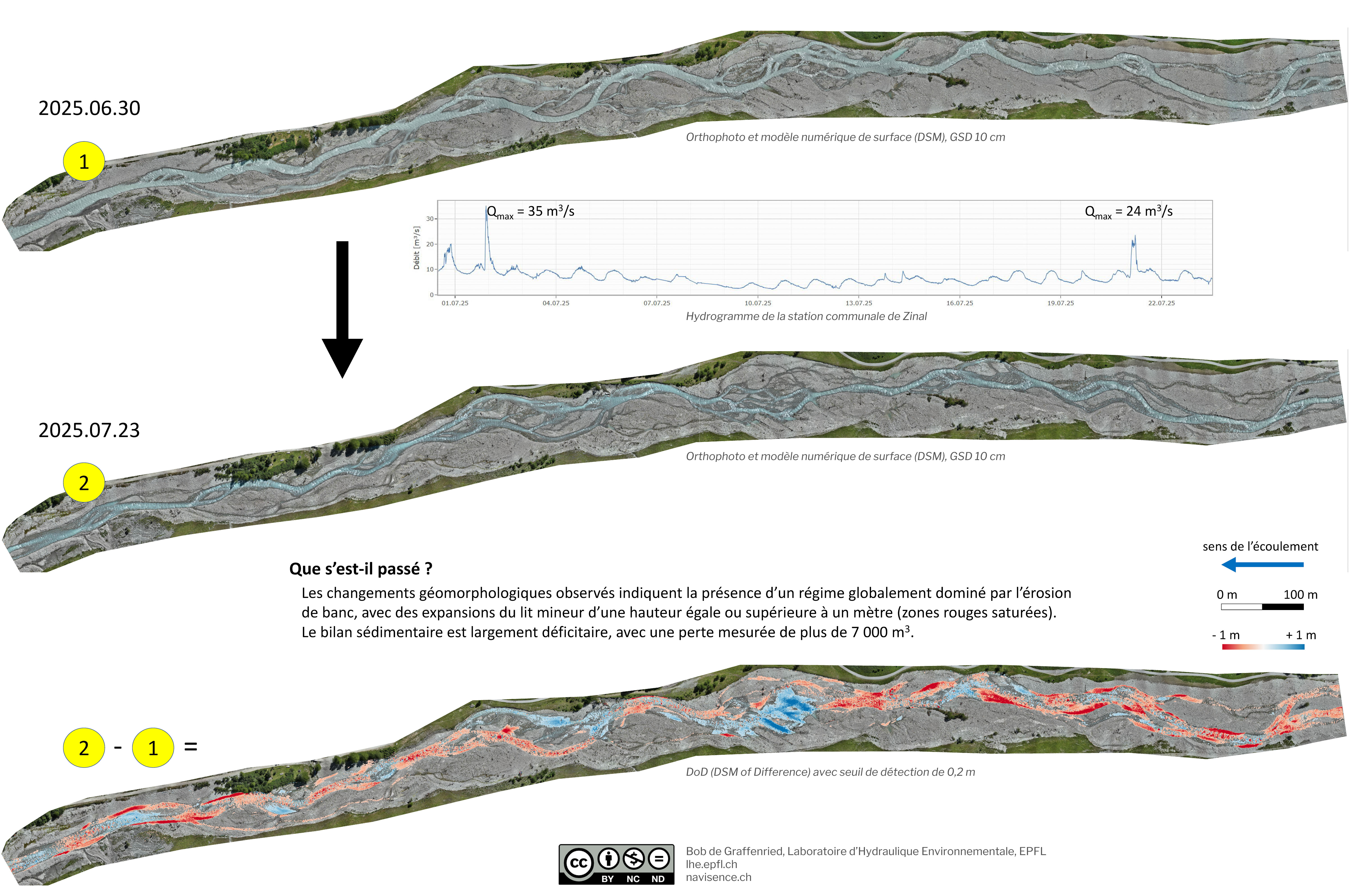 Le tableau ci-dessous liste les crues qui se sont produites en 2025 dont le débit a dépassé 20 m3/s. Pour chaque crue, le débit maximum et la durée pendant laquelle le débit a dépassé 20 m3/s sont mentionnés. La dernière colonne présente les changements géomorphologiques observés entre certaines dates sous la forme « mois.jour vs mois.jour ».